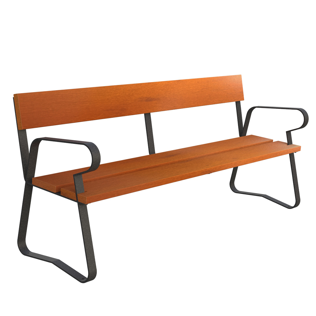 Banco modelo Madrid, con 3 listones de madera de Guinea de 2000x190x35 mm, con soportes en acero y pletina de apoyo pintados de color negro. Anclaje: 4 tornillos M10 x 100 mm ( No