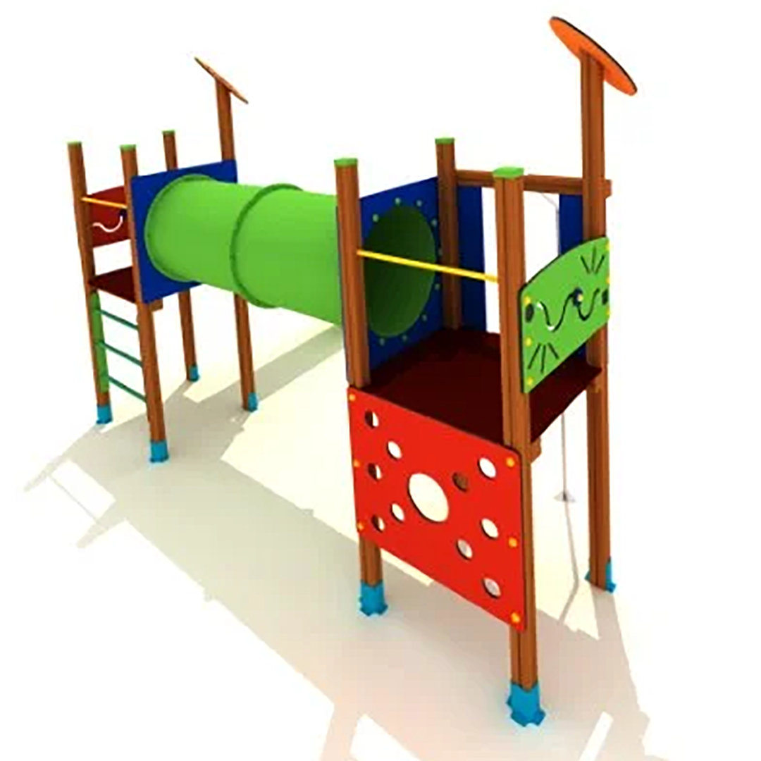 Conjunto de 2 torres con estructura principal de madera laminada y suelo cuadrado, con una escalera, rocódromo, 2 paneles interactivos, barra de bomberos, túnel y un tobogán de salida