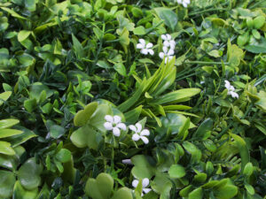 Jardín vertical de plantas sintéticas, imitación de follaje y flores de jazmín. Respaldado con una malla de plástico semirrígida. Fácil de instalar y altamente resistente.