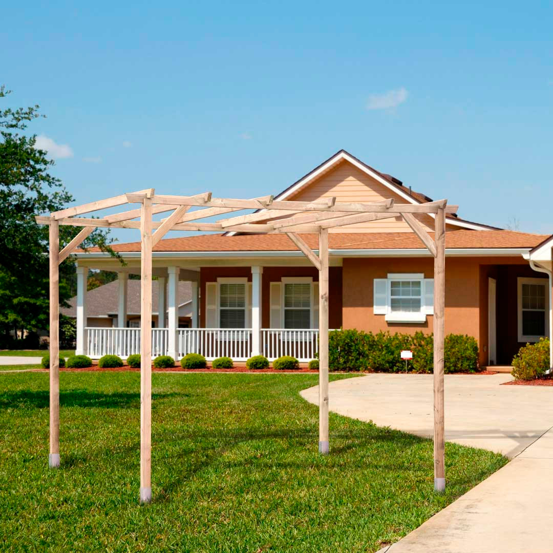 7×7 cm, esta pérgola es ideal para jardines, patios o terrazas de menor tamaño. Fabricada con madera de pino silvestre tratada en Autoclave III, garantiza una excelente protección frente a la humedad, el sol y otros factores climáticos, prolongando su durabilidad. Gracias a su certificación FSC, es una opción respetuosa con el medio ambiente, asegurando el uso de materiales procedentes de fuentes sostenibles.
