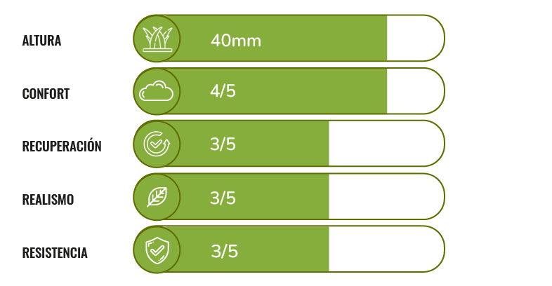 La combinación de dos tonos verdes en el hilo, así como dos tonos verdes y beige en el rizado, proporciona un acabado realista que simula perfectamente el césped natural.
