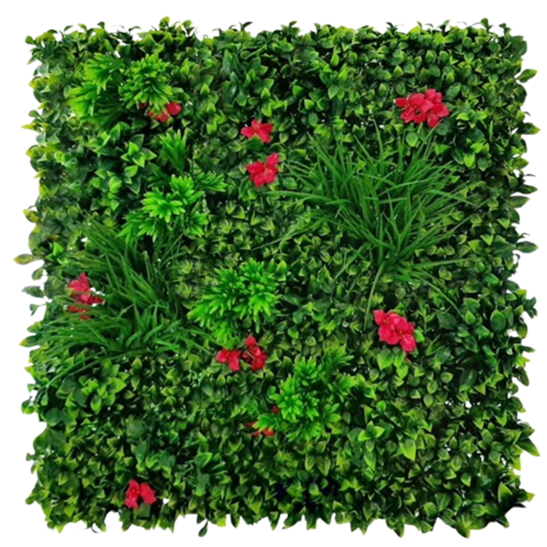 Jadín vertical imitación flores de buganvilla y otras plantas colgantes. Aspecto frondoso y espeso.
